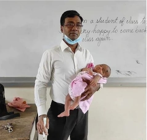 করোনাকালে বিয়ে হওয়া দশম শ্রেণির স্কুলছাত্রী গতকাল রোববার তার তিন মাস বয়সী মেয়েকে নিয়ে বিদ্যালয়ে উপস্থিত হয়। ক্লাসে ছাত্রীর মনোযোগে যেন ব্যাঘাত না ঘটে, সে জন্য শিশুটিকে কোলে নিয়ে পাঠদান করতে থাকেন সহকারী শিক্ষক পঙ্কজ কান্তি। ব্রাহ্মণবাড়িয়া সদর উপজেলার চিনাইর আঞ্জুমান আরা উচ্চবিদ্যালয়ের দশম শ্রেণির খ শাখার ইংরেজি ক্লাসে এই ঘটনা ঘটে। এই ছবি সামাজিক যোগাযোগমাধ্যম ফেসবুকে ছড়িয়ে পড়েছে। শিক্ষক পঙ্কজ কান্তি চাকরিসূত্রে ব্রাহ্মণবাড়িয়া জেলা শহরের দাতিয়ারা পৌর এলাকায় বসবাস করেন। তাঁর শিক্ষকতার বয়স ২১ বছর। দীর্ঘ ১১ বছর ধরে তিনি এই বিদ্যালয়ে শিক্ষকতা করছেন। খোঁজ নিয়ে জানা যায়, করোনার কারণে গত বছরের মার্চের মাঝামাঝি সময়ে শিক্ষাপ্রতিষ্ঠান বন্ধ ঘোষণা করে সরকার। সেই শিক্ষার্থী গত বছর ওই বিদ্যালয়ের নবম শ্রেণির ছাত্রী ছিল। শিক্ষাপ্রতিষ্ঠান বন্ধ থাকায় গত বছর ওই শিক্ষার্থীকে পাশের সুলতানপুর ইউনিয়নে বিয়ে দেন পরিবারের লোকজন। এক বছর পর ওই শিক্ষার্থীর সন্তানের জন্ম হয়। দীর্ঘ দেড় বছর পর কোলের তিন মাস বয়সী মেয়েশিশুকে নিয়ে গতকাল সকালে নিজের বিদ্যালয়ে যায় ছাত্রীটি। মেয়েকে কোলে নিয়ে ক্লাস করতে সমস্যা হচ্ছিল তার। এ সময় সহকারী শিক্ষক পঙ্কজ কান্তি এগিয়ে এসে ছাত্রীর সন্তানকে নিজের কোলে নিয়ে পড়ানো চালিয়ে যেতে থাকেন।