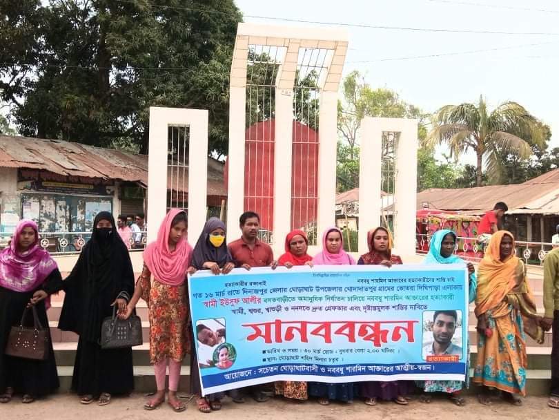 গত ১৬ মার্চ রাতে দিনাজপুর জেলার ঘোড়াঘাটের খোদাদাতপুর গ্রামের ভোতরা দিঘিপাড়া এলাকায় স্বামী ইউসুফ আলীর বসতবাড়ীতে অমানুষিক নির্যাতন চালিয়ে নববধূ শারমিন আক্তারের হত্যাকারী স্বামী, শ্বশুর, শ্বাশুড়ী ও ননদকে দ্রুত গ্রেফতার এবং দৃষ্টান্তমুলক শাস্তির দাবীতে মানববন্ধন অনুষ্ঠিত হয়েছে।