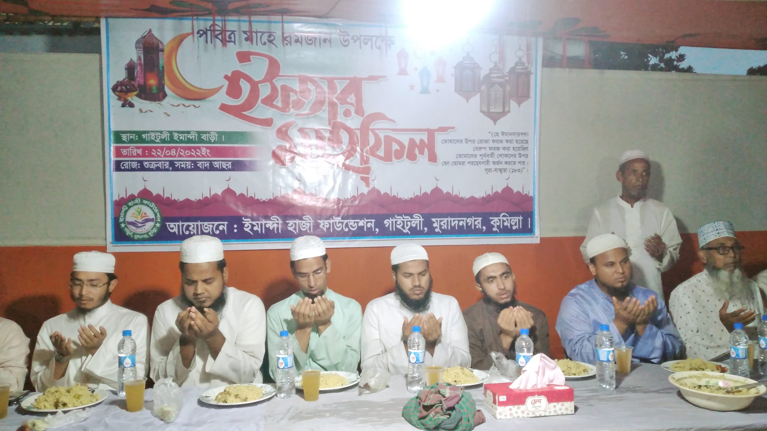 কুমিল্লা মুরাদনগর পবিত্র মাহে রমজান উপলক্ষে এতিম শিশুদেরকে সাথে নিয়ে   ইফতার ও দোয়া মাহফিলের আয়োজন করেছে স্বেচ্ছাসেবী সামাজিক সংগঠন ঈমান্দী হাজী ফাউন্ডেশন।  শুক্রবার সন্ধ্যায় উপজেলার ধামঘর ইউনিয়নের গাইটুলি ঈমান্দী বাড়িতে গাইটুলি মোহাব্বতীয়া ইসলামীয়া মাদ্রাসা ও এতিমখানা শিশুদের নিয়ে ইফতার ও দোয়া মাহফিল অনুষ্ঠিত হয়।